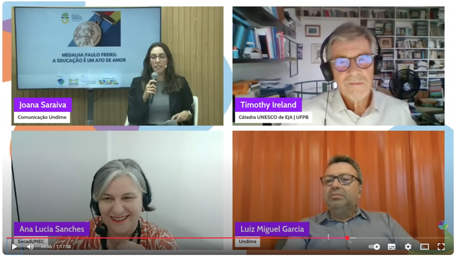 A apresentação da iniciativa aconteceu em videoconferência da Undime, por meio do Conviva Educação, com participação de Ana Lucia Sanches, diretora de Políticas de Alfabetização e Educação de Jovens e Adultos da Secadi/MEC; e Timothy Denis Ireland, representante da Cátedra Paulo Freire/UNESCO. A mediação foi de Luiz Miguel Garcia, presidente da Undime e Dirigente Municipal de Educação de Sud Mennucci/SP.