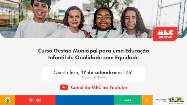 Nesta quarta-feira, 17 de setembro, o Ministério da Educação (MEC) lançará o curso on-line de Gestão Municipal para uma Educação Infantil de Qualidade com Equidade. A iniciativa tem o objetivo de apoiar os gestores municipais na implementação das Diretrizes Operacionais de Qualidade e Equidade para a Educação Infantil. O evento será transmitido às 14h (horário de Brasília) pelo canal do MEC no YouTube. Clique aqui para acompanhar.