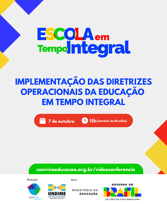 Nesta terça-feira, 7 de outubro, às 15h (horário de Brasília), o Conviva Educação e a Undime promovem uma videoconferência sobre a implementação das Diretrizes Operacionais da Educação em Tempo Integral, em parceria com o Ministério da Educação (MEC).