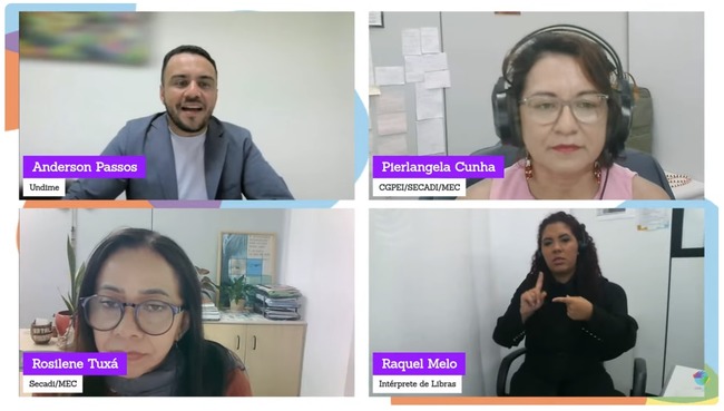 Participaram da videoconferência: Rosilene Tuxá, diretora de Políticas de Educação Escolar Indígena; e Pierlangela Nascimento da Cunha, coordenadora-geral de Políticas Educacionais Indígena, ambas da Secretaria de Educação Continuada, Alfabetização de Jovens e Adultos, Diversidade e Inclusão (Secadi) do Ministério da Educação. A mediação ficou sob responsabilidade do presidente da Undime Bahia e Dirigente Municipal de Educação de Aratuípe/BA, Anderson Passos.